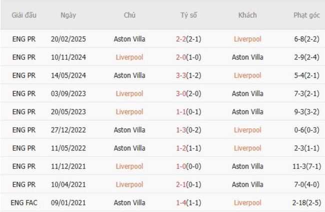 Thành tích đối đầu quá khứ giữa Liverpool vs Aston Villa